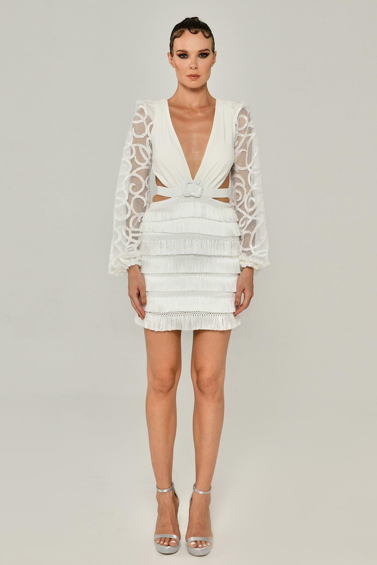 HANZADE ALTAYLIUzun Kol Sırtı İp Bağcıklı Eteği Saçaklı Kısa Elbise