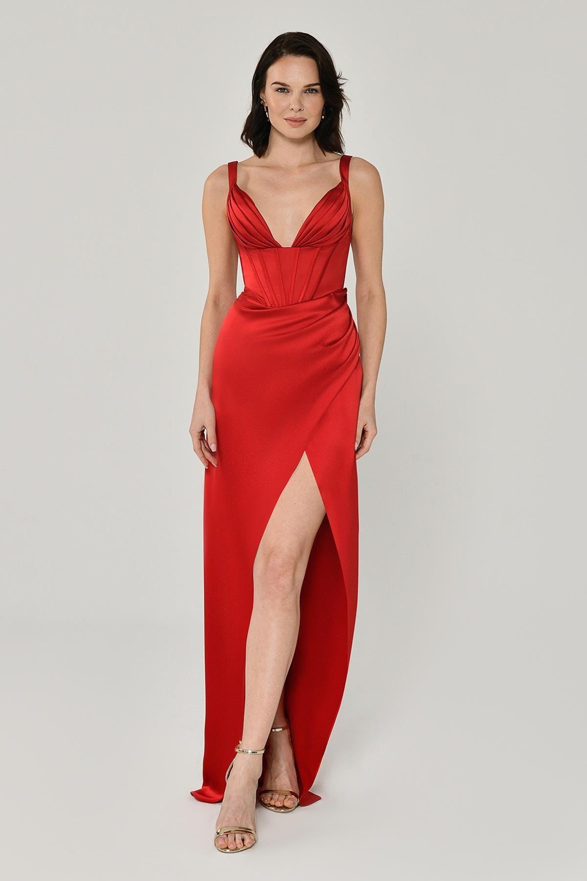 Askılı Derin V Yaka Asimetrik Kesim Uzun Elbise Askılı Derin V Yaka Asimetrik Kesim Uzun Elbise