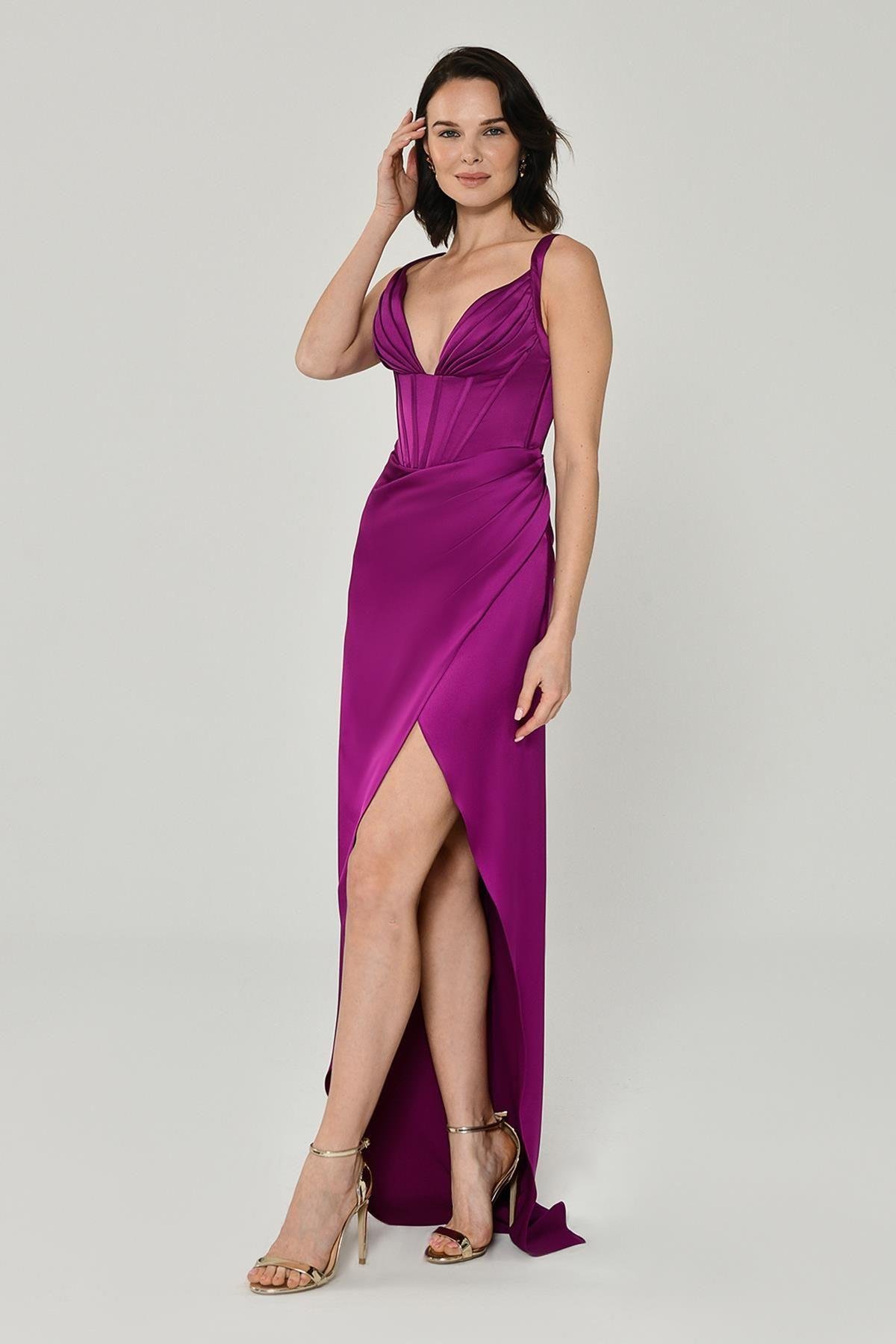 Askılı Derin V Yaka Asimetrik Kesim Uzun Elbise Askılı Derin V Yaka Asimetrik Kesim Uzun Elbise
