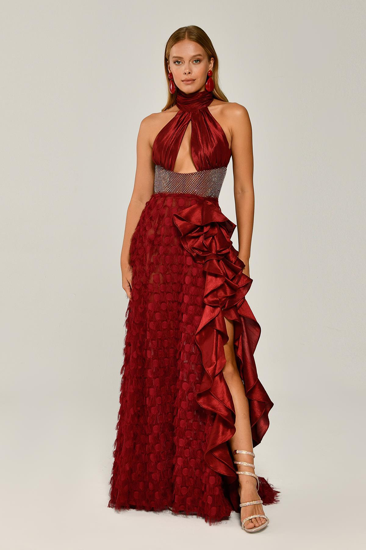 HANZADE ALTAYLIBoyundan Bağlama File Korseli Eteği Fırfırlı Uzun Elbise