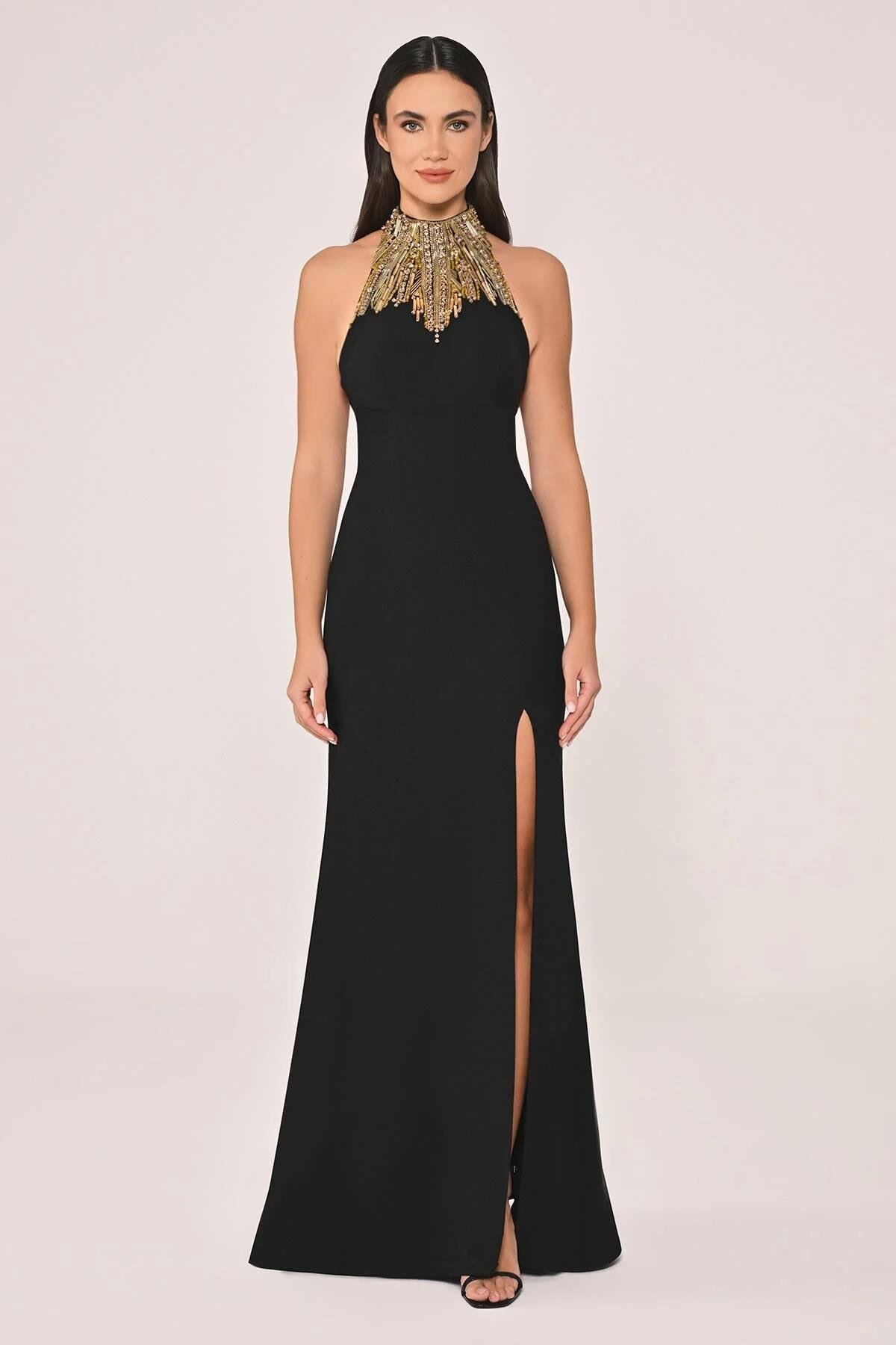 ALFABETAHalter Yaka Üstü ve Sırt Aksesuarlı Krep Uzun Elbise