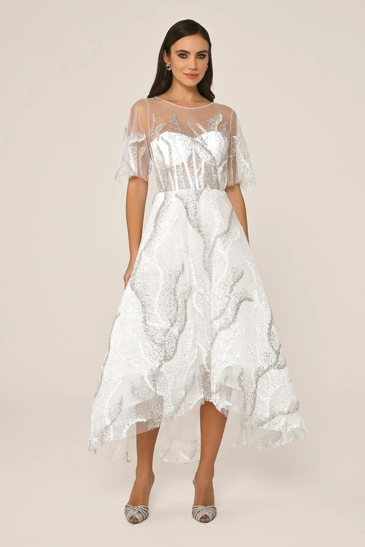 Kısa Kollu Parlak Tül Midi Abiye Elbise (6645)