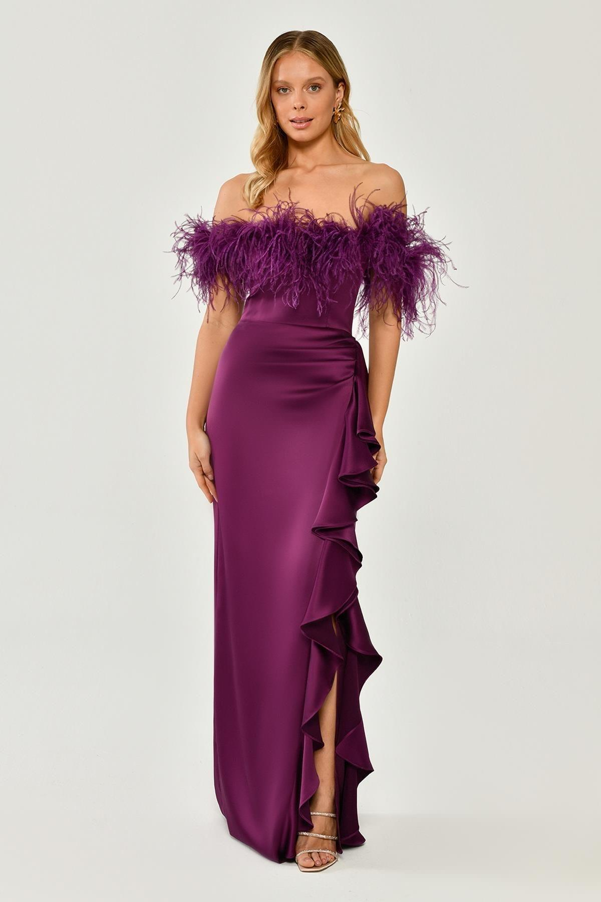 Omzu Tüylü Düşük Kol Yırtmaçlı Saten Uzun Elbise (6348)