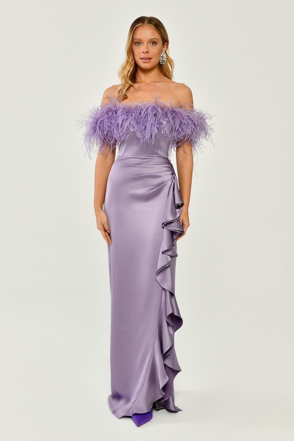 Omzu Tüylü Düşük Kol Yırtmaçlı Saten Uzun Elbise