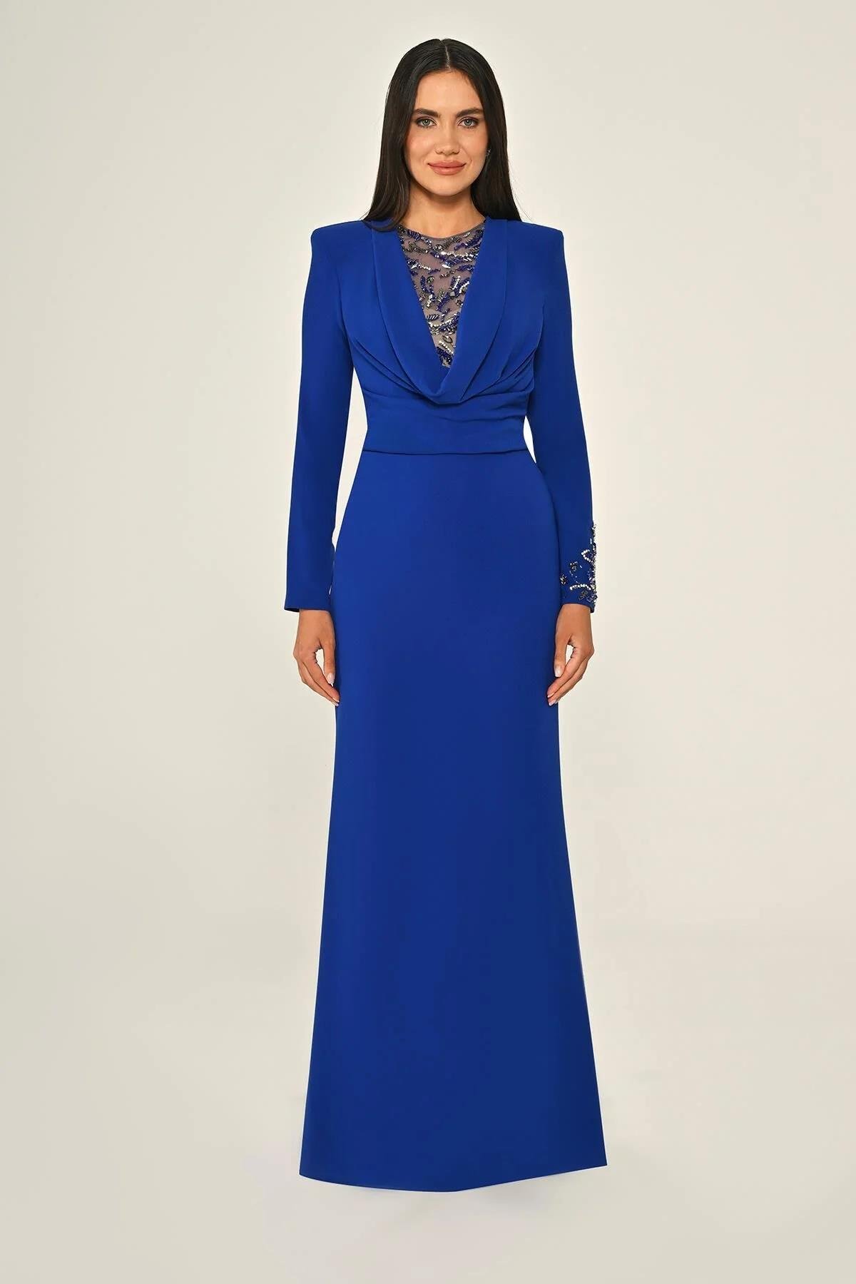 Payetli Göğüs Degaje Yaka Krep Uzun Elbise (7020)
