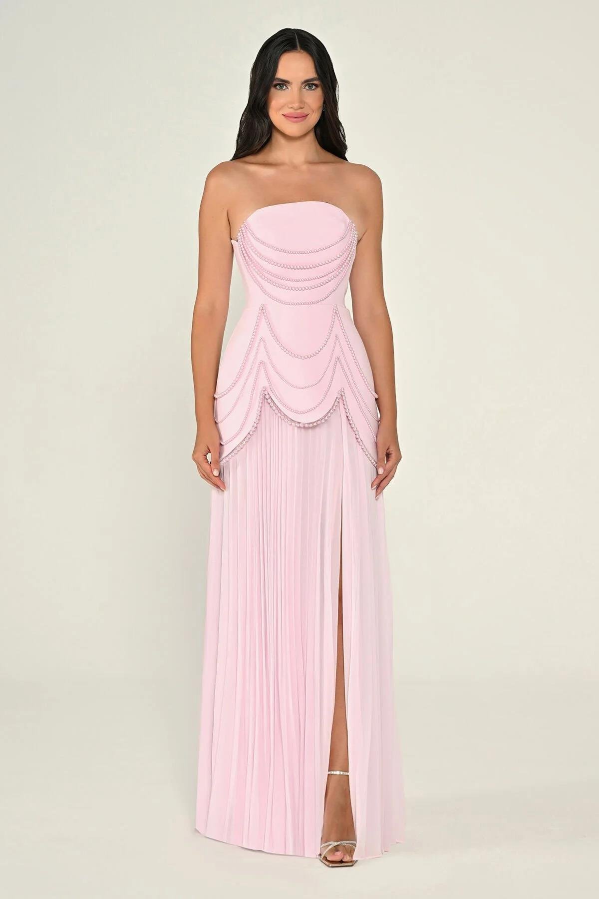 Straplez Boncuklu Eteği Piliseli Şifon Üst Krep Uzun Elbise