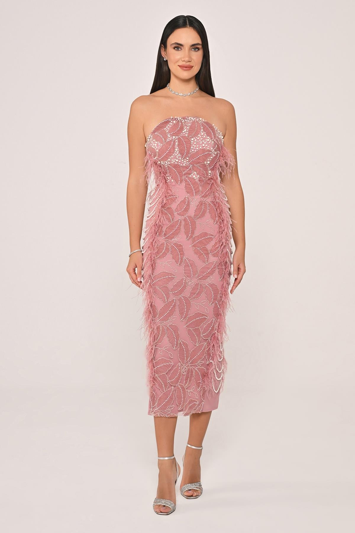 Straplez Boncuklu Otrişli Midi Elbise (6929)