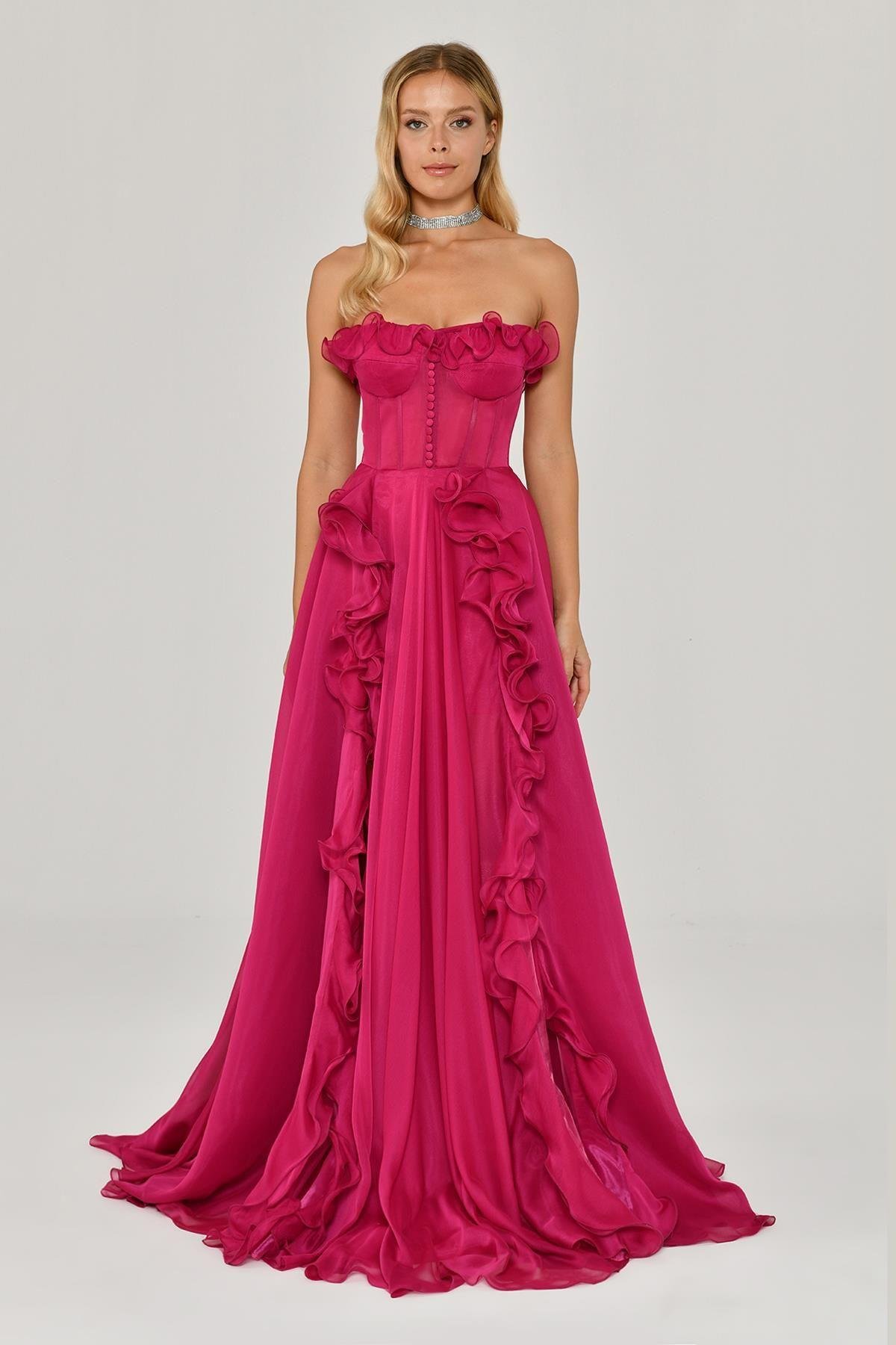 Straplez Fırfırlı Yırtmaçlı Uzun Tül Elbise (5782)