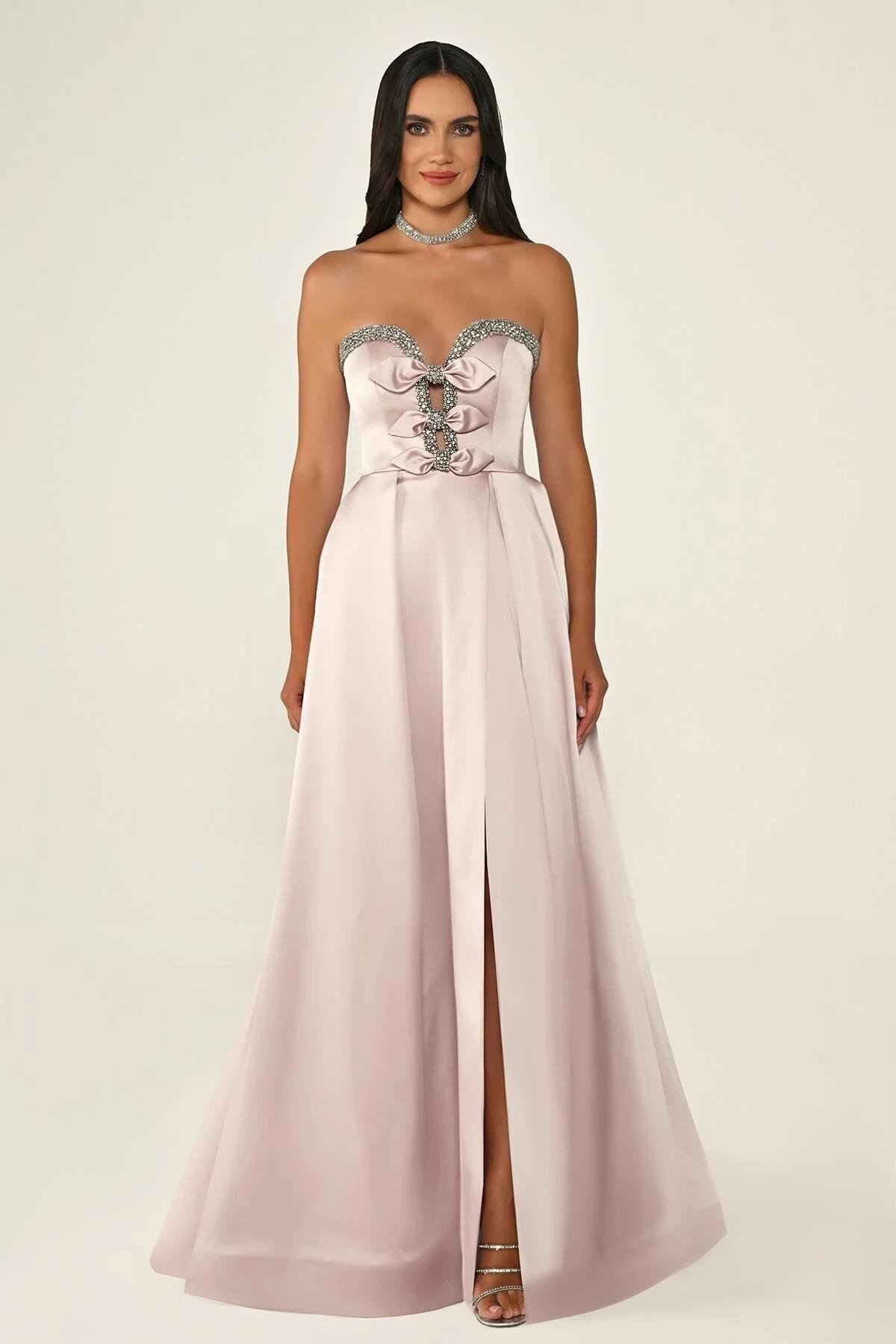 ALFABETAStraplez Göğüs Taşlı Saten Uzun Elbise