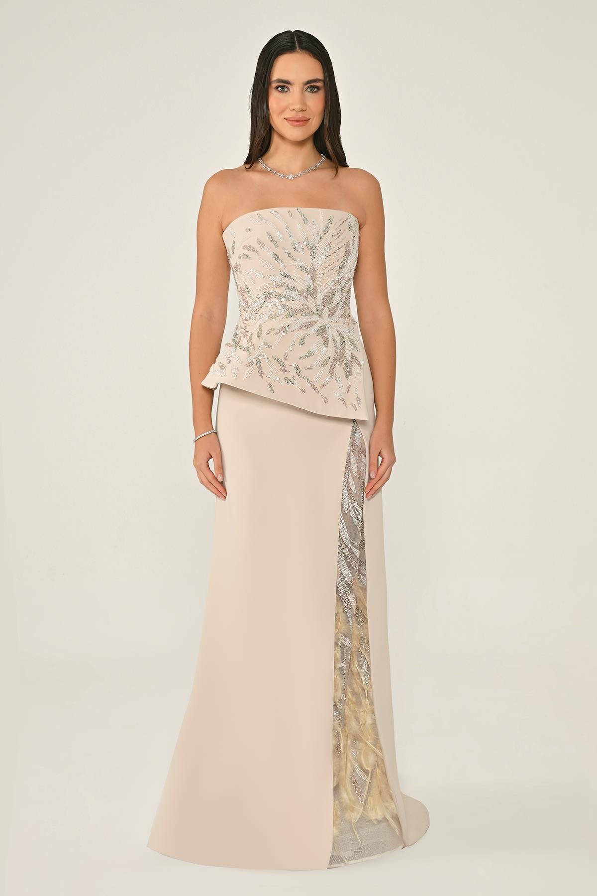 Straplez İşlemeli Yırtmacı Otrişli Tül Krep Uzun Elbise (6814)