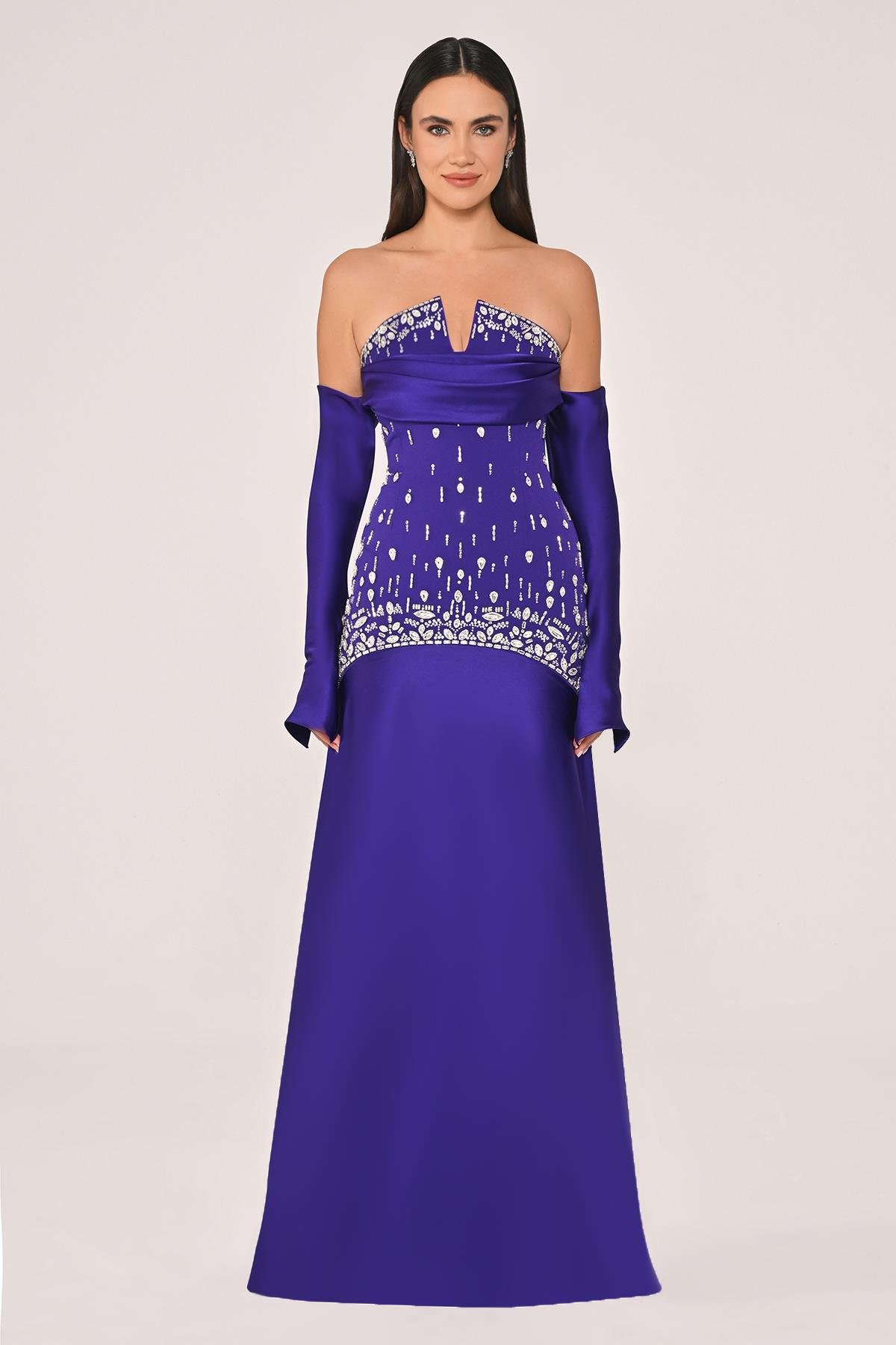 Straplez Taş Aksesuarlı Kollu Saten Uzun Elbise (6936)