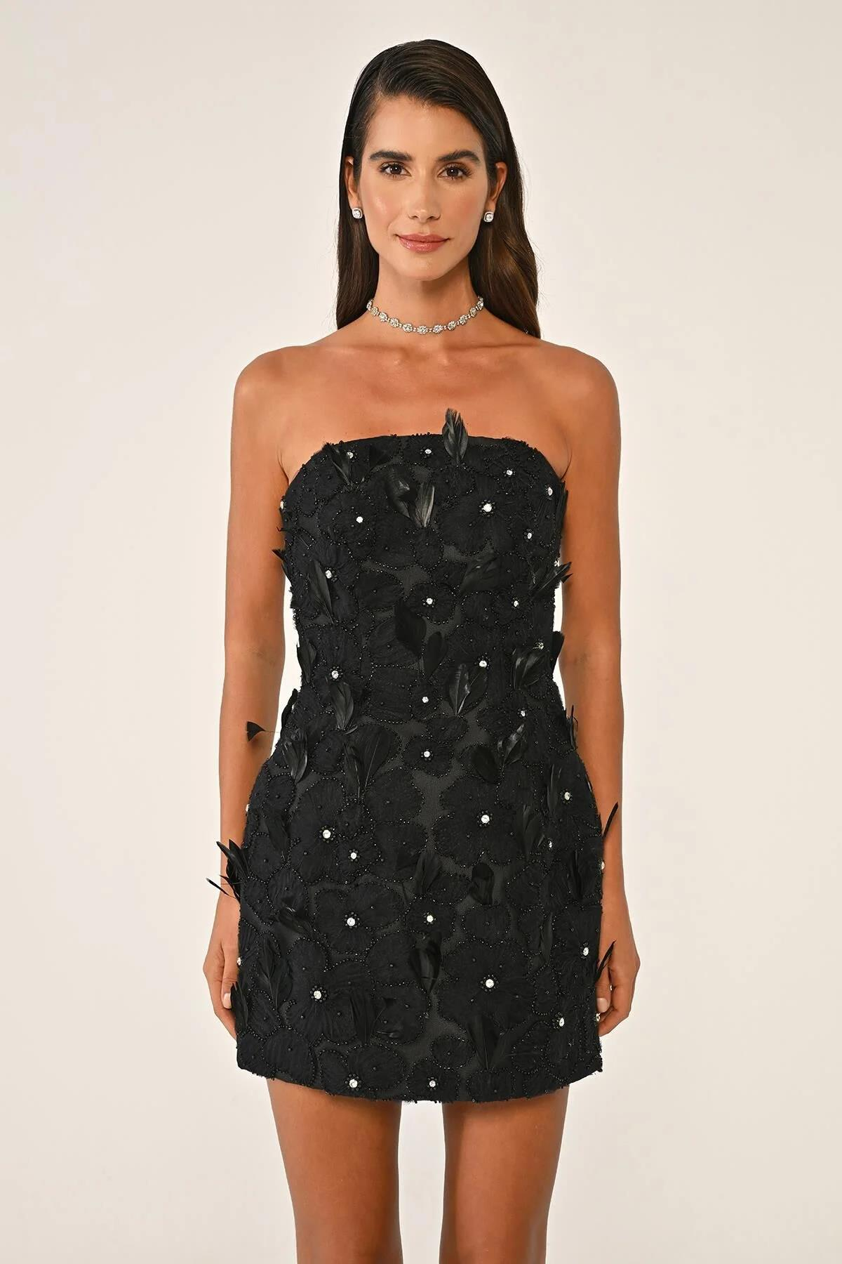 ALFABETAStraplez Tüylü Çiçek Aksesuarlı Krep Kısa Elbise