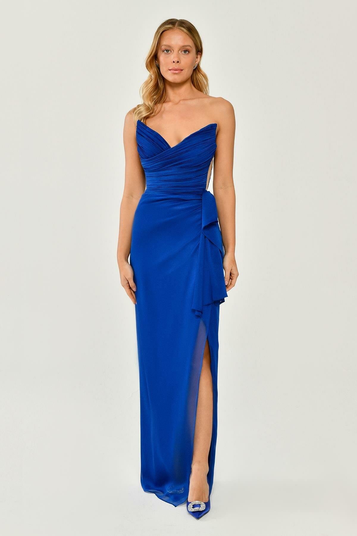 HANZADE ALTAYLIStraplez Üst Pliseli Yandan Yırtmaçlı Şifon Uzun Elbise