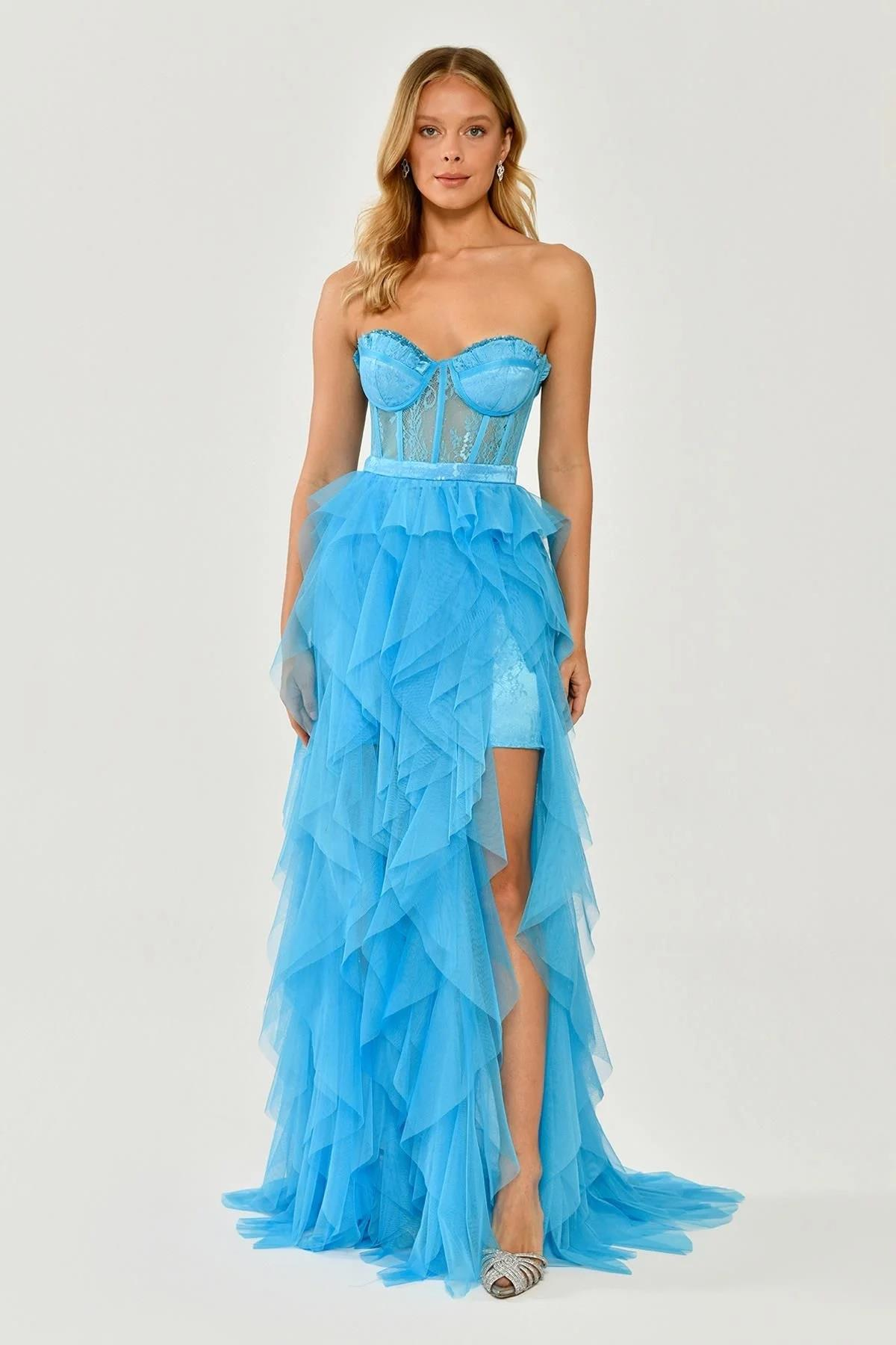 Straplez Yırtmaçlı Katlı Tül Elbise (5576)