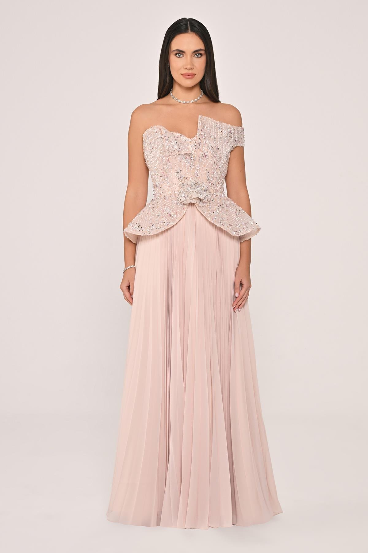 Tek Düşük Omuz Üstü Payet Eteği Pliseli Şifon Uzun Elbise (6904)