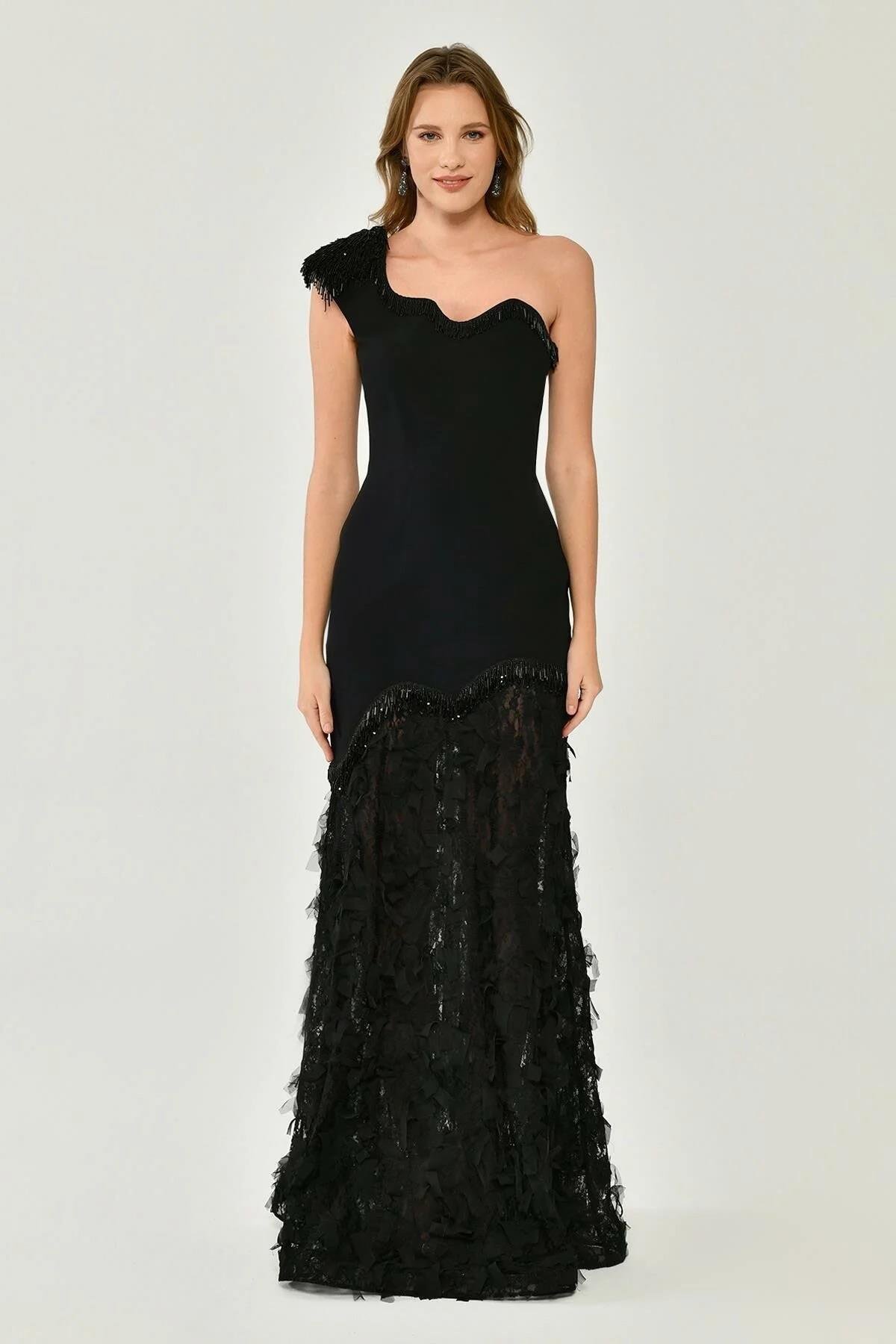 Tek Omuz Saçaklı Boncuk Aksesuarlı Eteği Tüllü Kumaş Krep Uzun Elbise (6338)