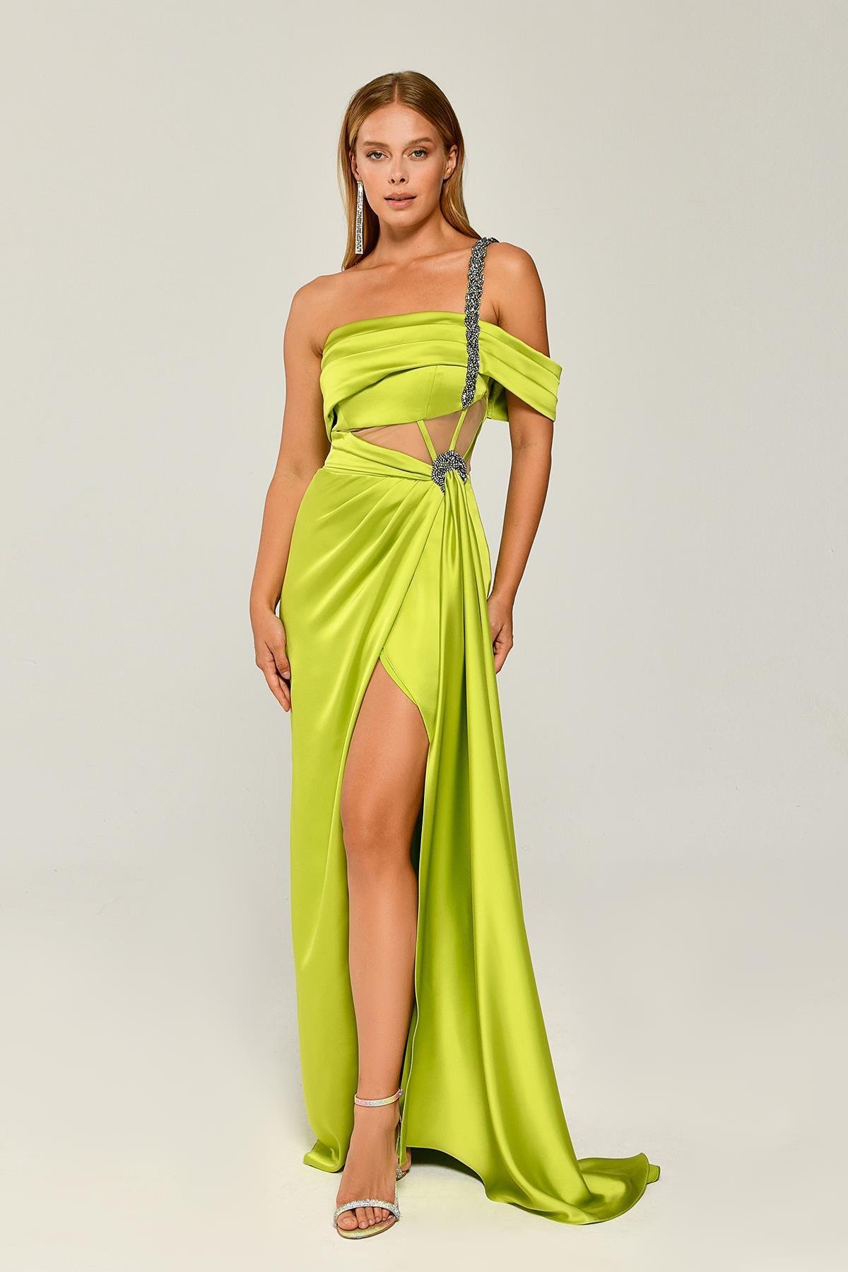 Tek Omuz Taşlı Zincir Askılı Yırtmaçlı Uzun Elbise
