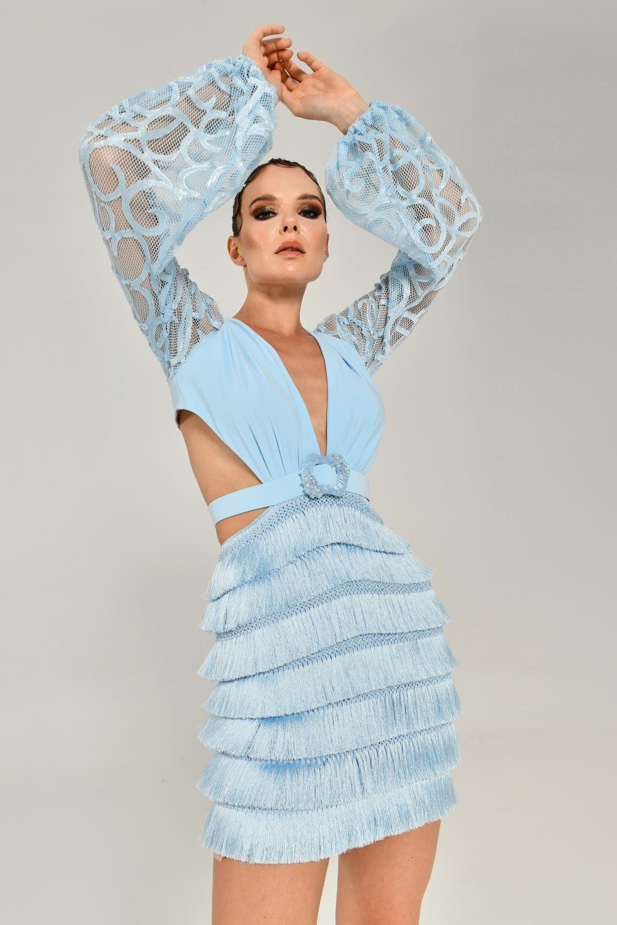 HANZADE ALTAYLIUzun Kol Sırtı İp Bağcıklı Eteği Saçaklı Kısa Elbise