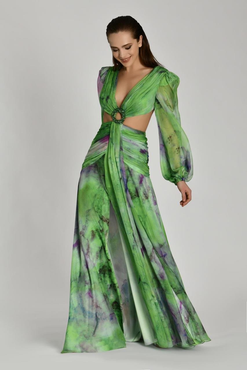 HANZADE ALTAYLIUzun Kollu Önden Tokalı Yırtmaçlı Uzun Elbise