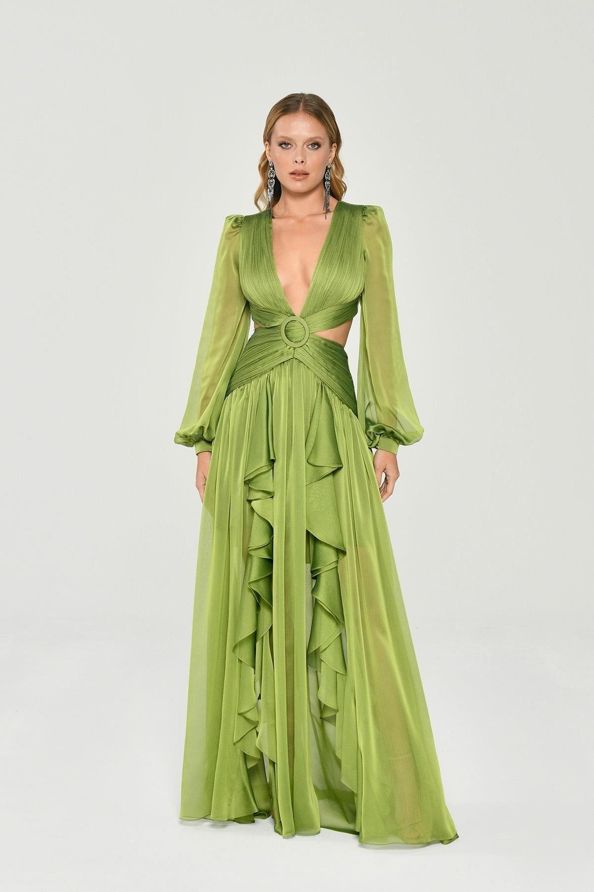 HANZADE ALTAYLIV Yaka Çift Önden Tokalı Yırtmaçlı Uzun Elbise