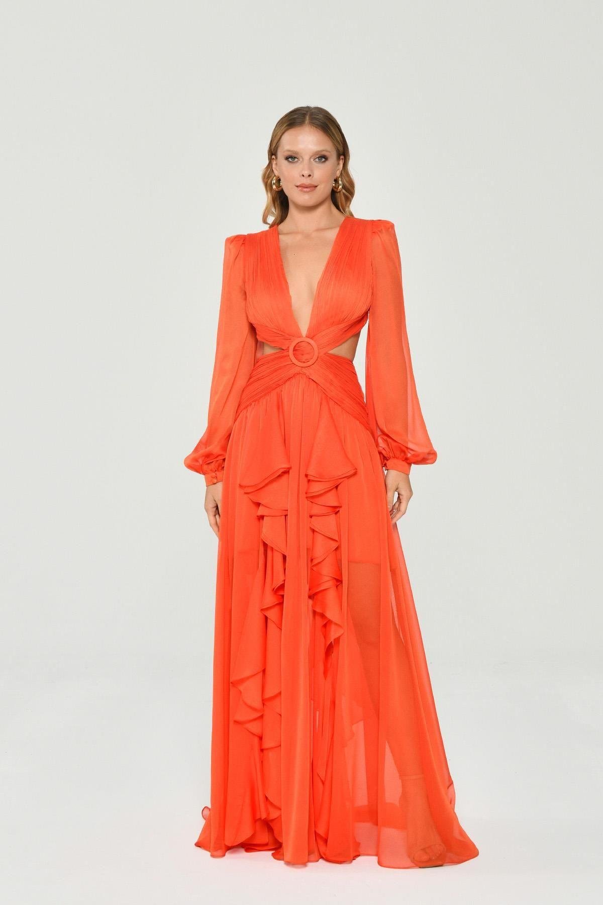 V Yaka Çift Önden Tokalı Yırtmaçlı Uzun Elbise (5638)