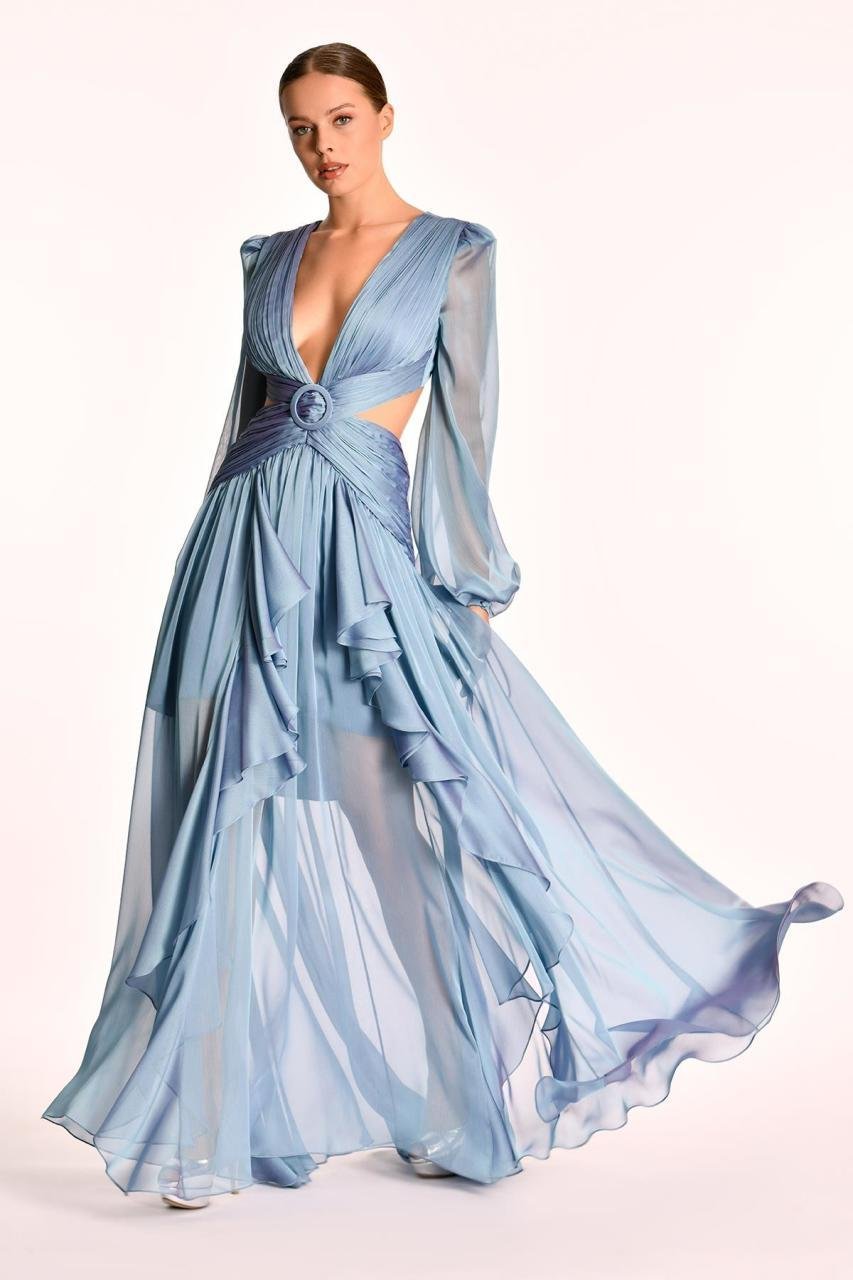 HANZADE ALTAYLIV Yaka Çift Önden Tokalı Yırtmaçlı Uzun Elbise