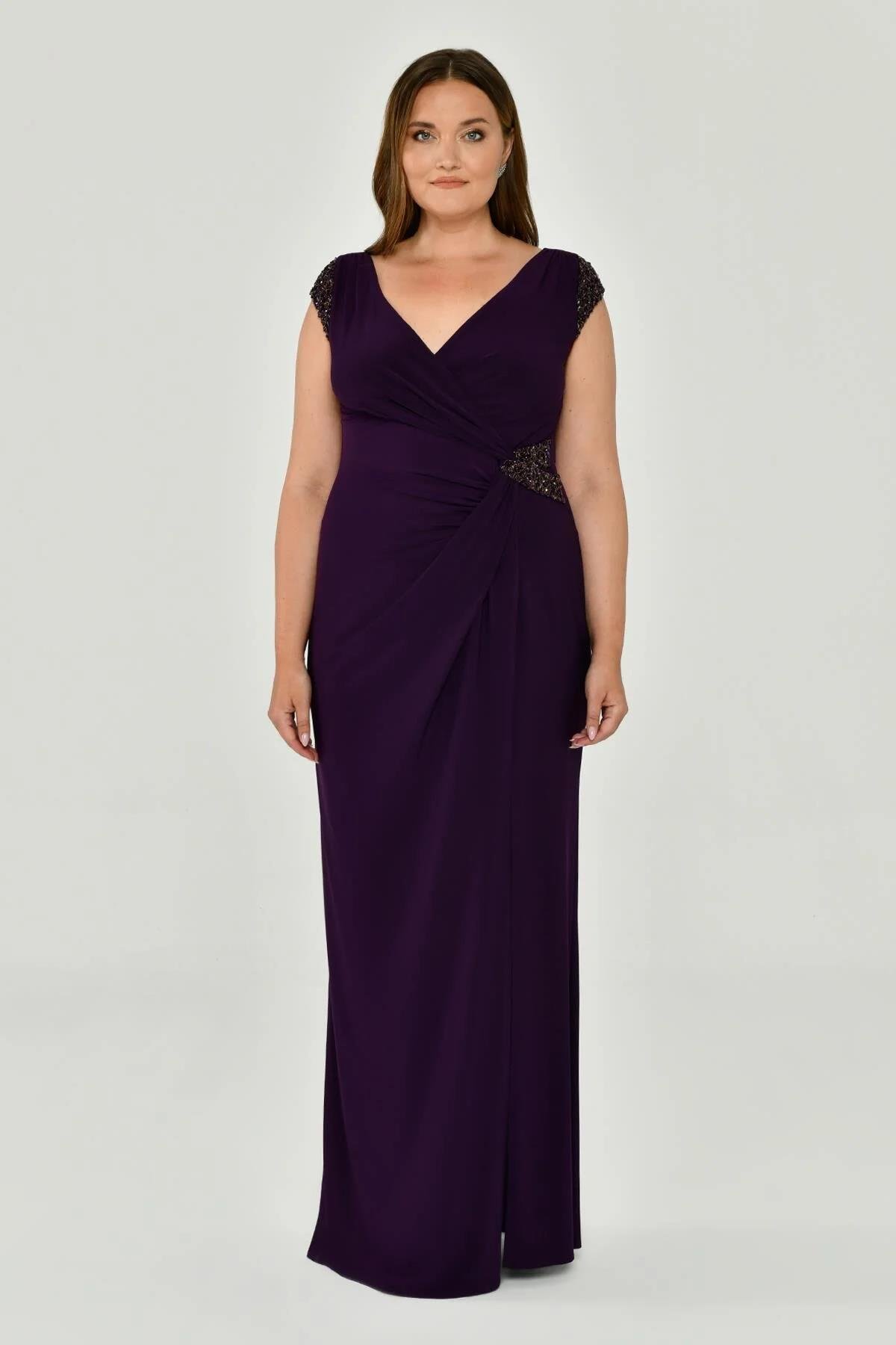 V Yaka Kısa Kollu Beli Aksesuarlı Yırtmaçlı Uzun Elbise (5849)