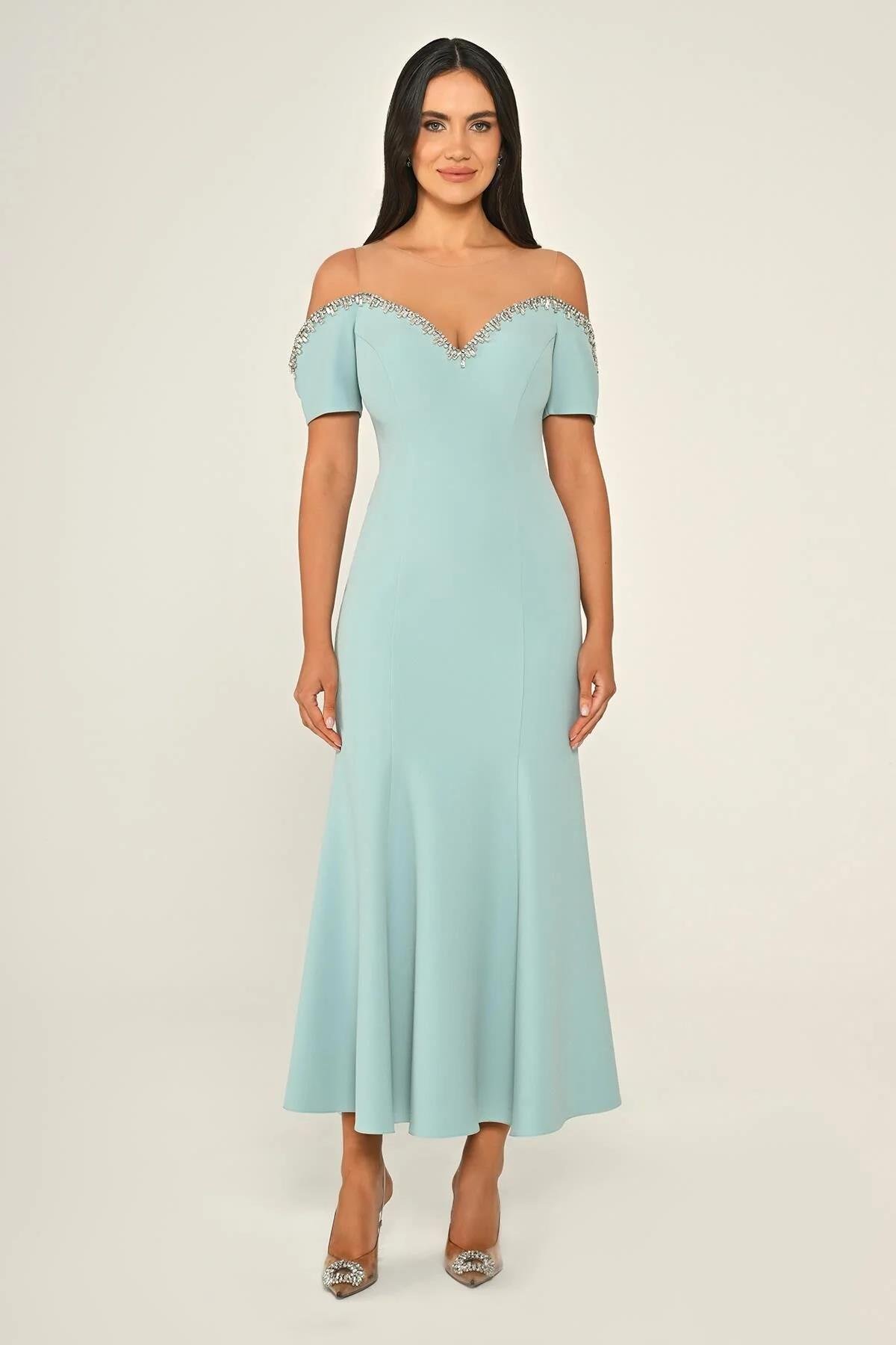 Yakası Taşlı Düşük Kol Krep Midi Elbise (7043)